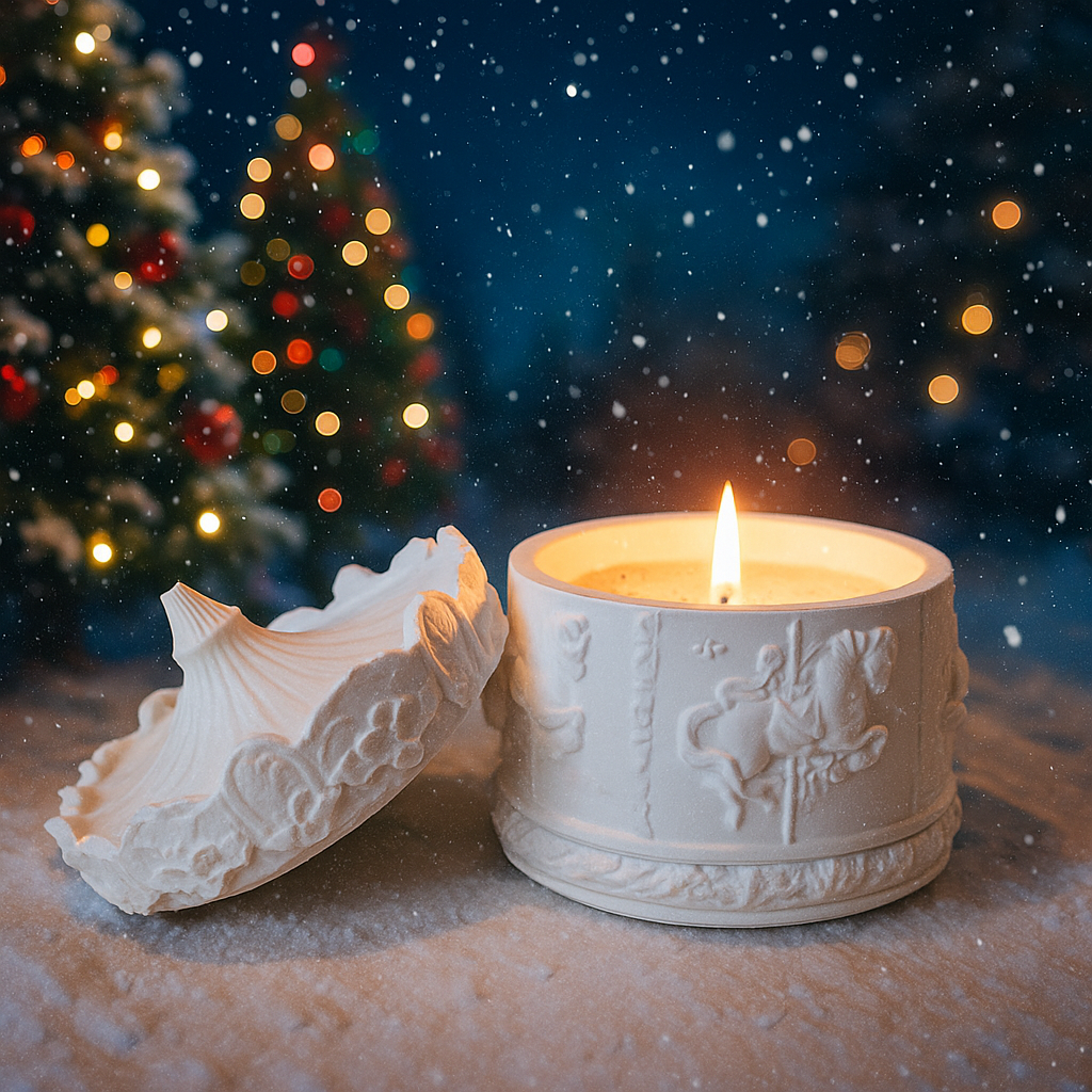 Bougie Carrousel entièrement fait à la main pot en plâtre, cire de soja, fragrance et paillettes.
